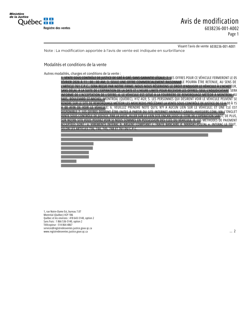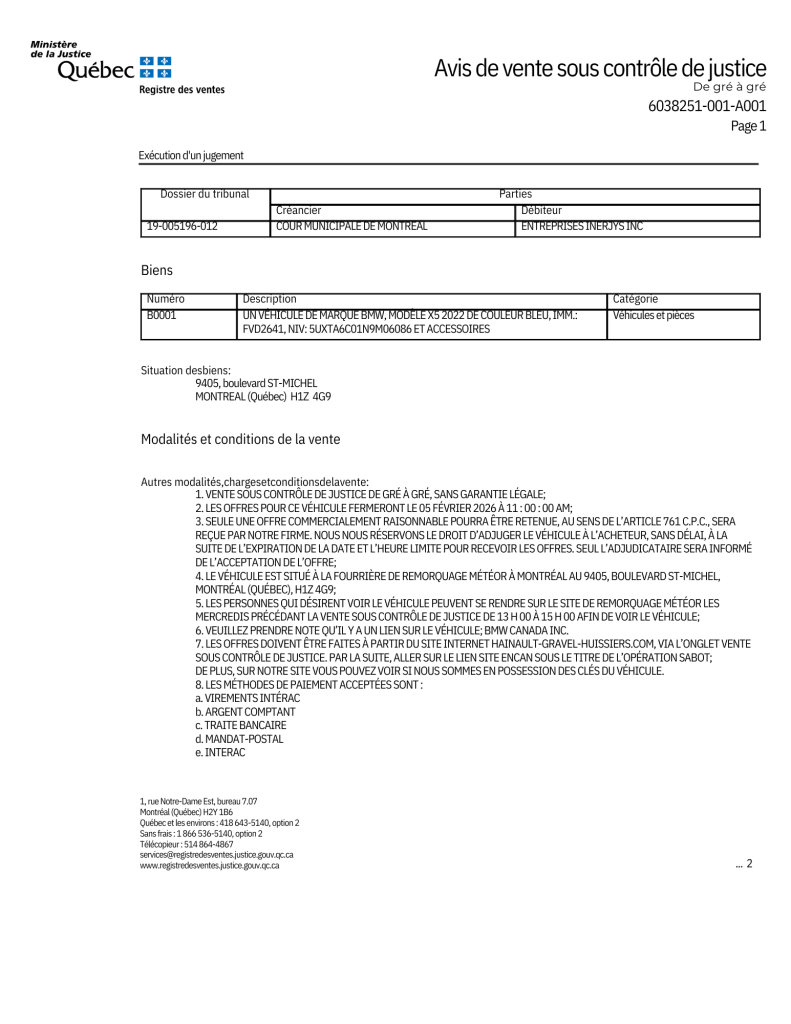 LES MISES POUR LA VENTE DE CE VÉHICULE FERMERONT LE 05 FÉVRIER 2026 À 11:00:00