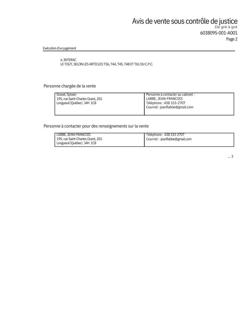Si vous remportez l’enchère, nous vous contacterons par téléphone et vous aurez jusqu’à 14 h 00 le jour même de la vente pour nous faire parvenir le montant de l’enchère remportée, sans quoi vous perdrez le droit sur votre enchère. Le paiement pourra être effectué par virement Interac, virement bancaire ou en personne dans l’un de nos bureaux, en argent comptant, par chèque certifié ou par carte de débit.