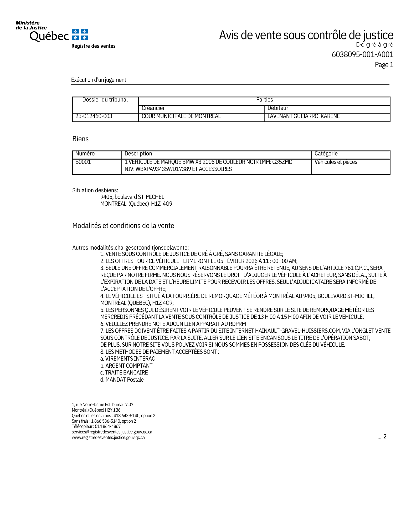 LES MISES POUR LA VENTE DE CE VÉHICULE FERMERONT LE 05 FÉVRIER 2026 À 11:00:00