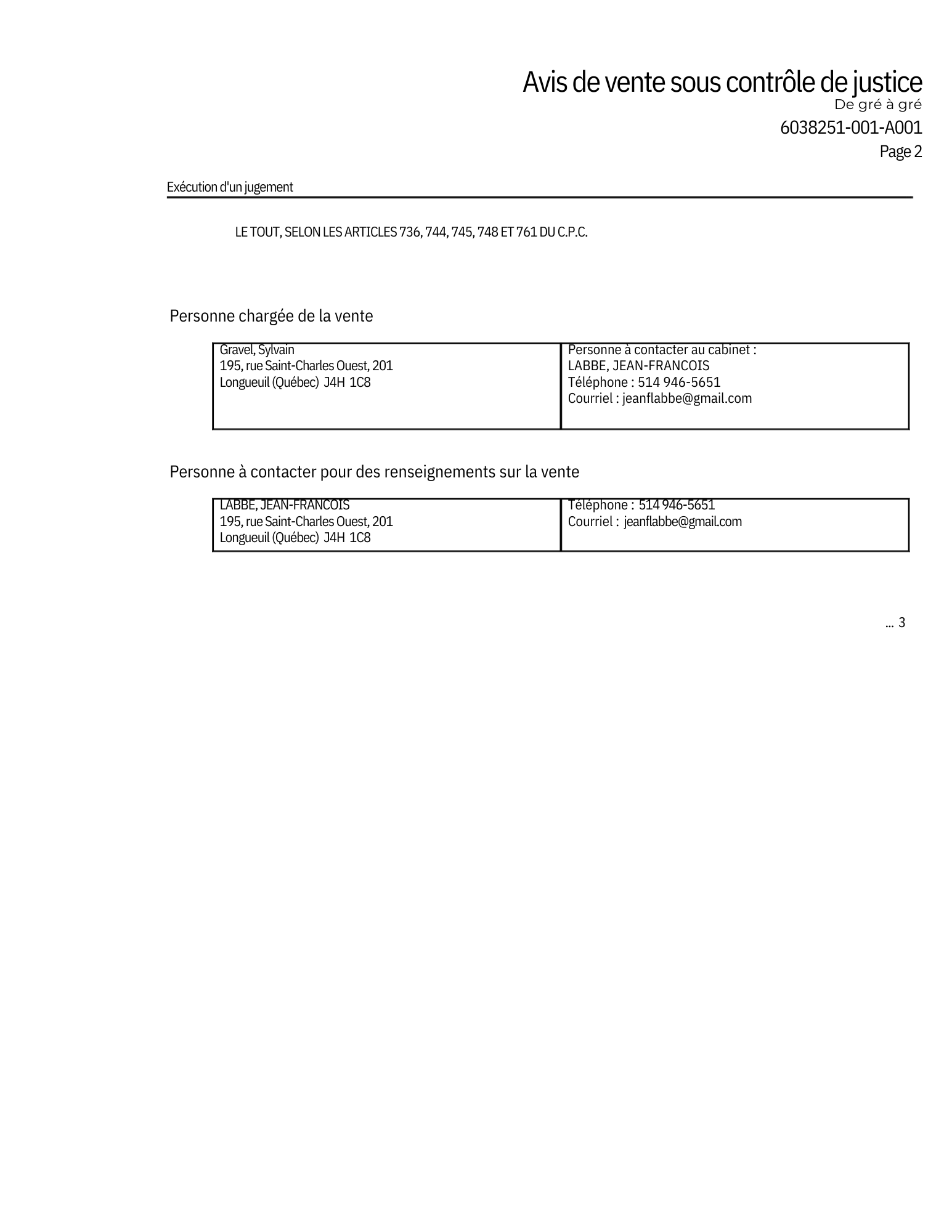 La vente d’un bien mobilier sous contrôle de justice de gré à gré est faite sans garantie légale, vendue telle que vue, sans clef, à moins d’indications contraires à la description du bien;